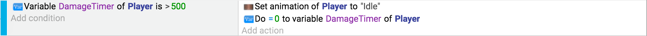 Here is a more advanced Timer example. The timer is used to briefly protect the player from damage. The amount of time given to protect the player depends on the value of the variable "player_undestroyable_time":