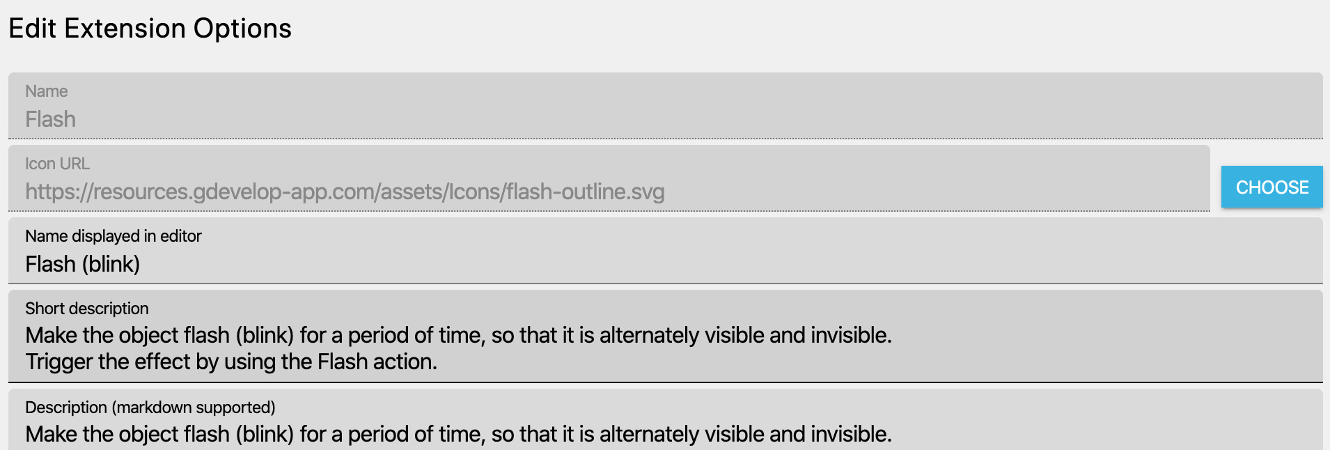 Once you're done, click on "Export Extension" at the bottom, then on "Export to a File". Choose a file and enter the same name as your extension, finishing by .json. For example: Flash.json.