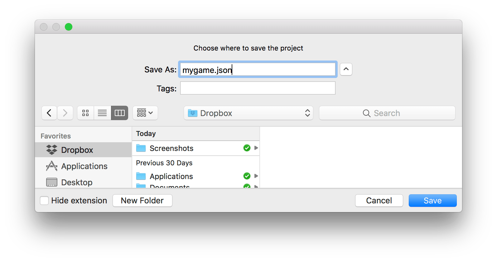 • Choose a folder, then enter a filename finishing by .json. For example: