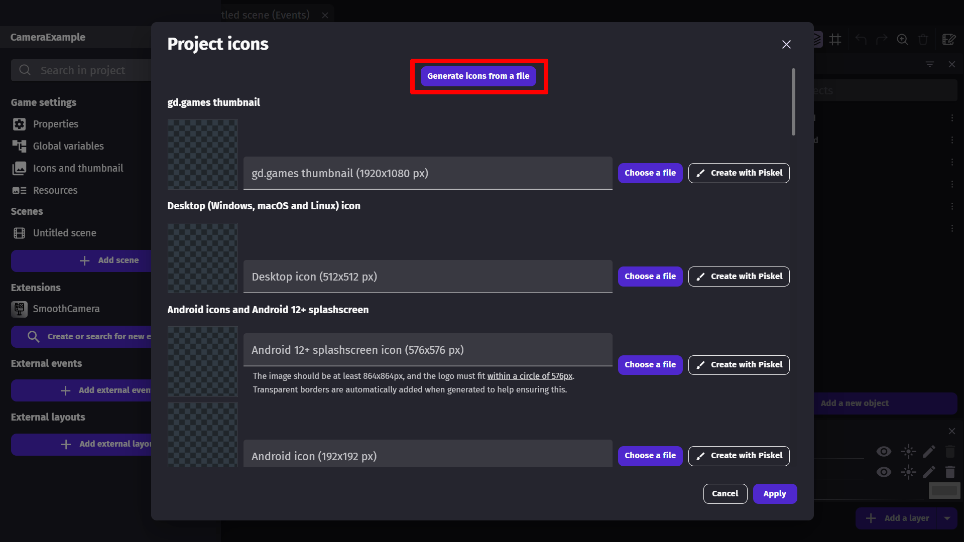 When you click on Icons and thumbnail in the Project Manager, a window is opened where you can set icons for the game that will be used when it's exported as a Windows/macOS/Linux app or an Android/iOS mobile game. In this window you can also add a thumbnail for your game to be used if it's published on GDevelop's games hosting platform gd.games.