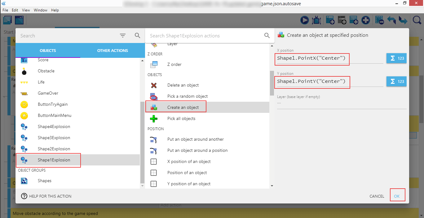 Add a new action: "Shape1Explosion" in the list of objects, look for "Create and object", and then X position to Shape1.PointX("Center") and Y position to Shape1.PointY("Center"), so they spawn in the middle of the shape they are going to replace.